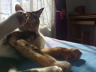 Curly had a bath and jumped on the sofa! So naughty! Then, my Mum put her on the bed! She is not allowed to be there though, it was just for the photo!